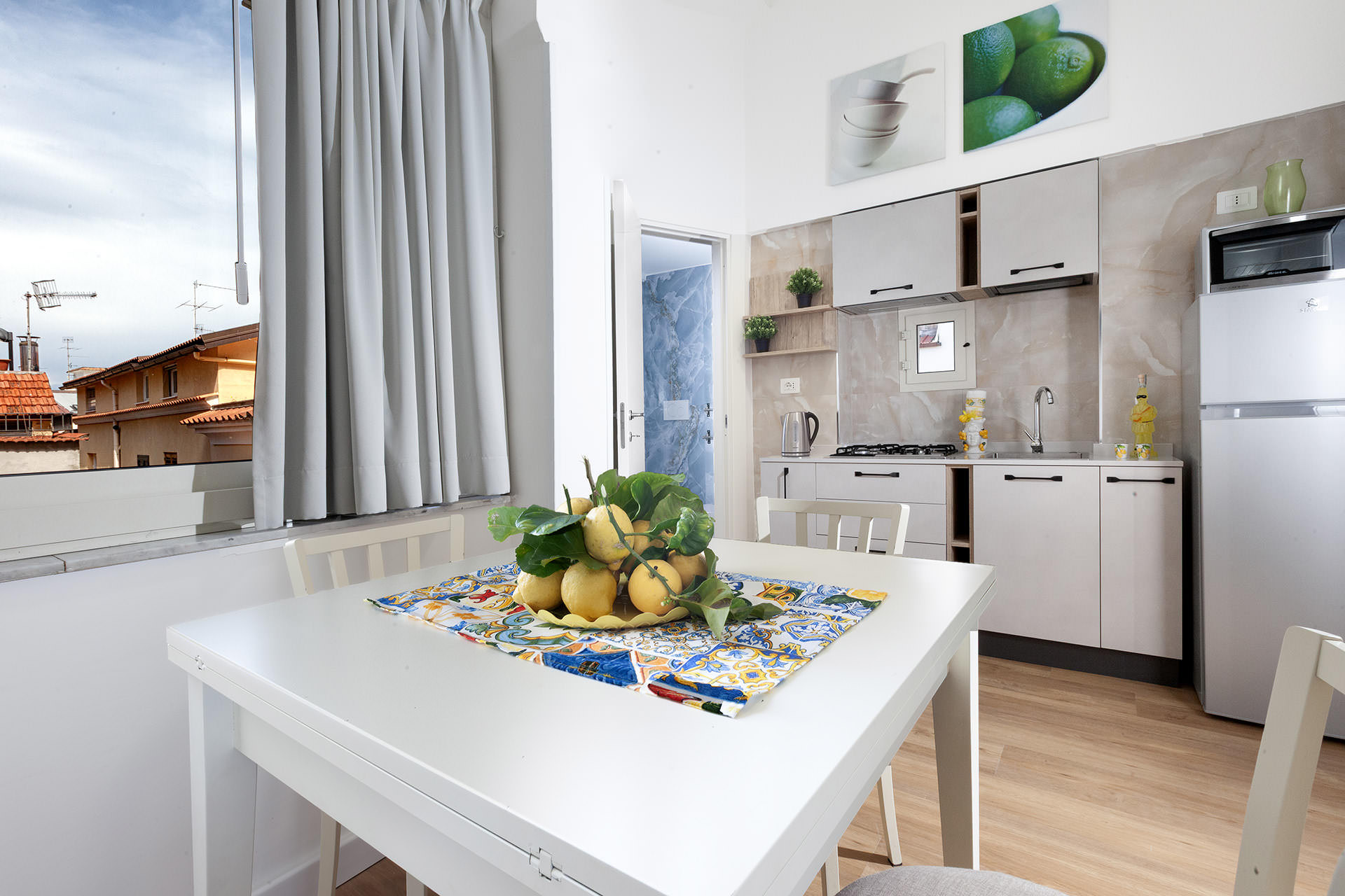 Il luminoso soggiorno/cucina è ben attrezzato, con elettrodomestici moderni e utensili da cucina per preparare i vostri piatti preferiti. La cucina offre anche una vista caratteristica sulla vivace isola pedonale di Corso Italia e sul campanile di Sorrento, creando un’atmosfera unica per i vostri pasti. Il soggiorno è un'area perfetta per rilassarsi dopo una giornata di esplorazione della città.