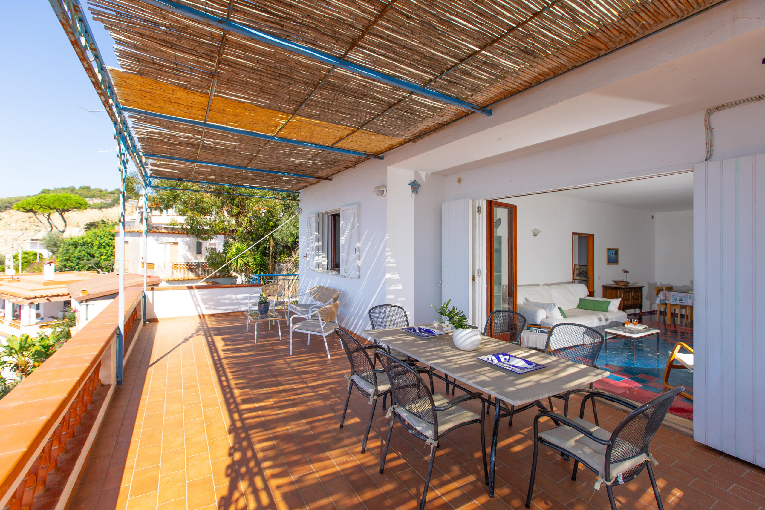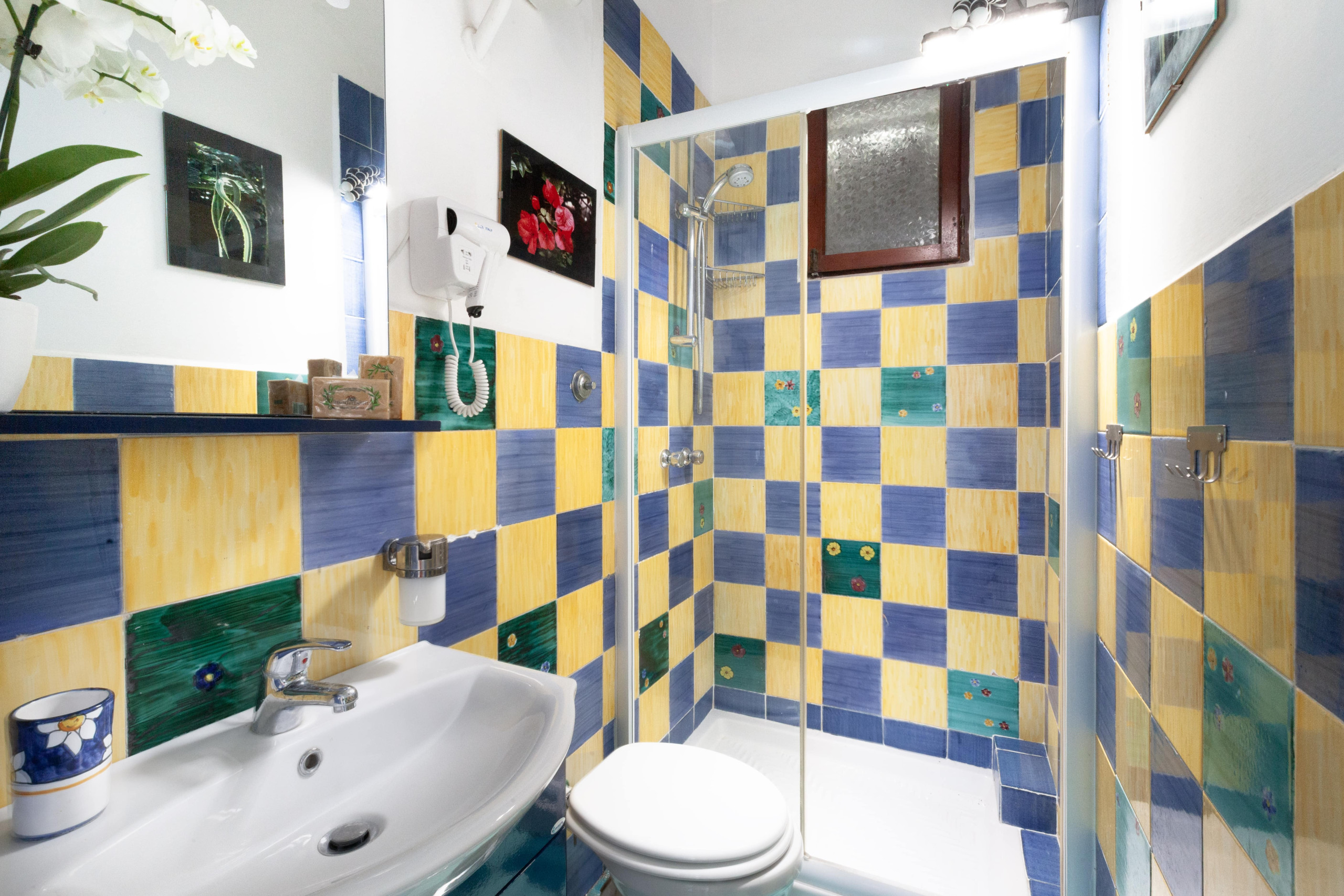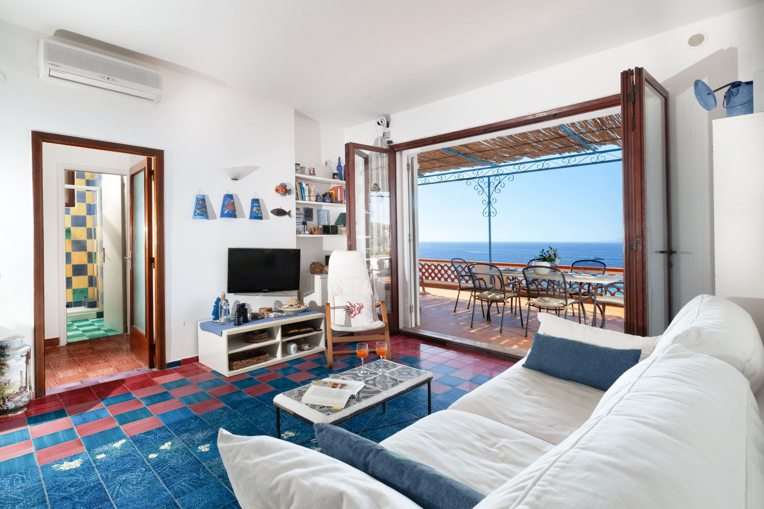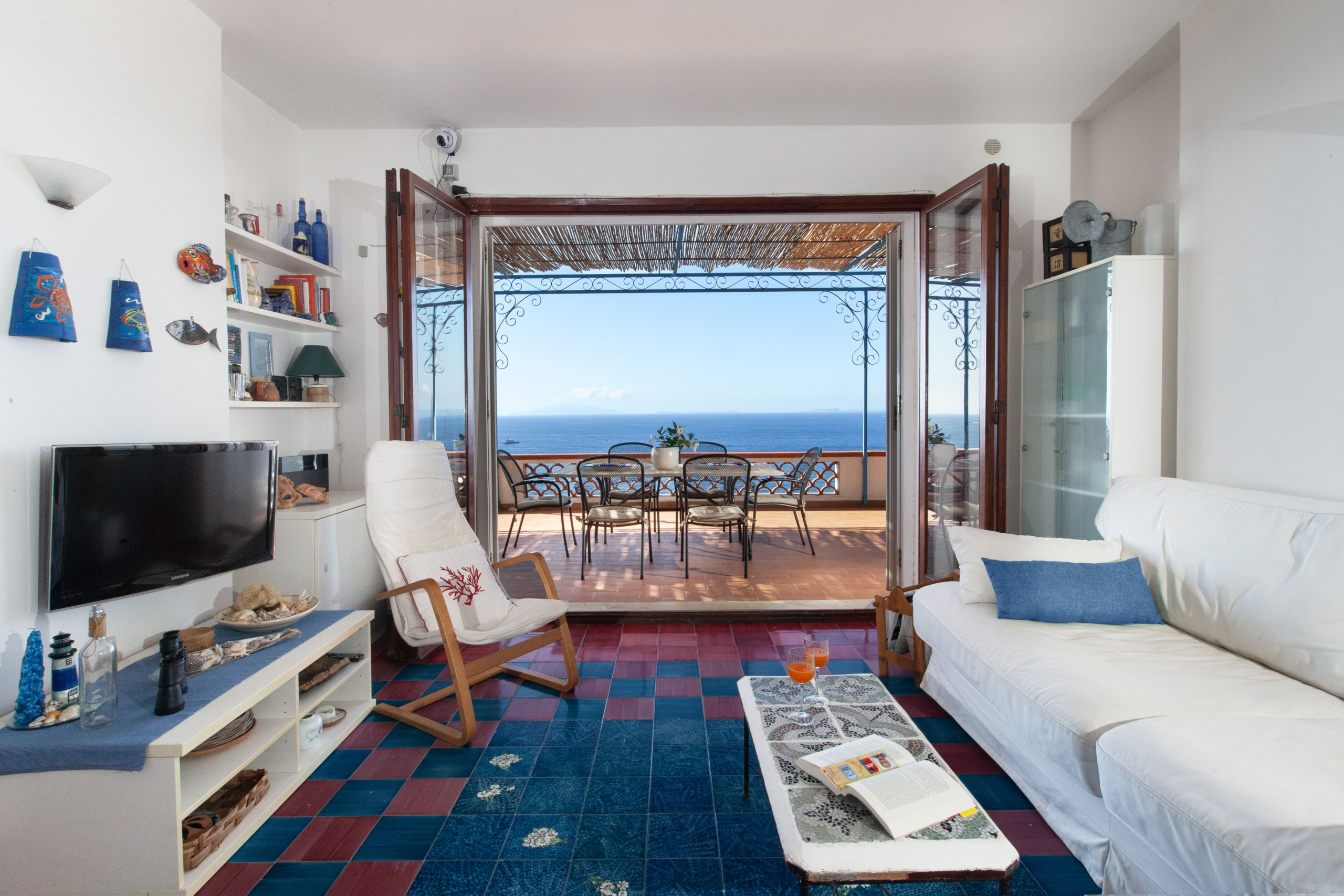 Dal soggiorno si accede direttamente alla terrazza panoramica: un vero e proprio angolo di pace, dove rilassarsi a ogni ora del giorno. Che sia l’alba che tinge di rosa l’orizzonte, il mare che scintilla a mezzogiorno o un tramonto infuocato sul Golfo di Napoli, ogni momento passato qui sarà un ricordo indelebile della vostra vacanza.